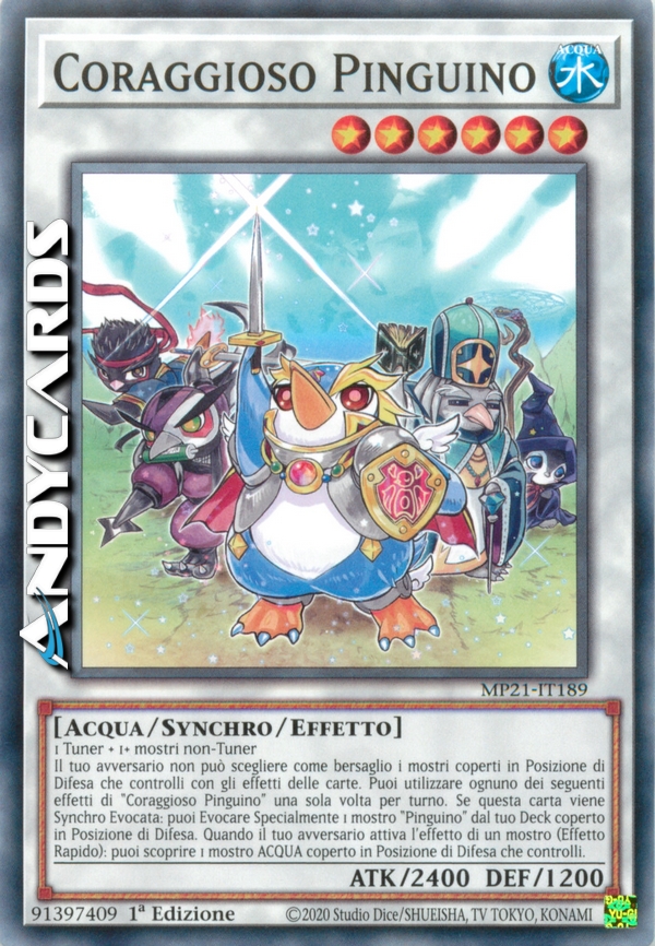 Il tuo avversario non può scegliere come bersaglio i mostri coperti in Posizione di Difesa che controlli con gli effetti delle carte. Puoi utilizzare ognuno dei seguenti effetti di "Coraggioso Pinguino" una sola volta per turno. Se questa carta viene Synchro Evocata: puoi Evocare Specialmente 1 mostro "Pinguino" dal tuo Deck coperto in Posizione di Difesa. Quando il tuo avversario attiva l'effetto di un mostro (Effetto Rapido): puoi scoprire 1 mostro ACQUA coperto in Posizione di Difesa che controlli.