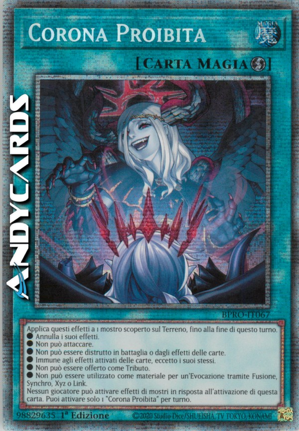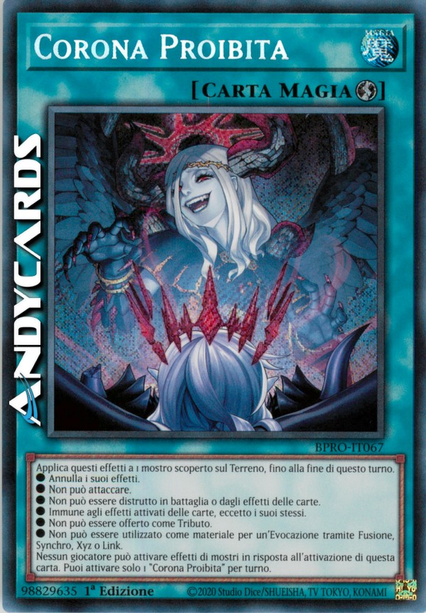Nessun giocatore può attivare effetti di mostri in risposta all'attivazione di questa carta. Puoi attivare solo 1 "Corona Proibita" per turno.