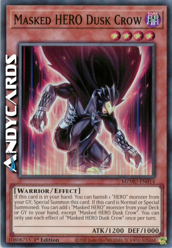 If this card is in your hand: You can banish 1 "HERO" monster from your GY; Special Summon this card. If this card is Normal or Special Summoned: You can add 1 "Masked HERO" monster from your Deck or GY to your hand, except "Masked HERO Dusk Crow". You can only use each effect of "Masked HERO Dusk Crow" once per turn.