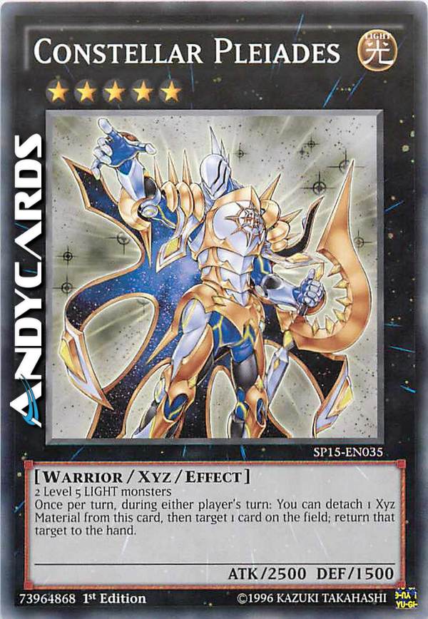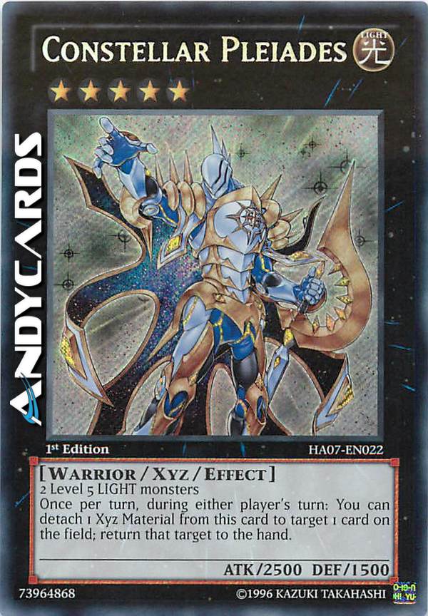 2 mostri LUCE di Livello 5 Una volta per turno, durante il turno di qualsiasi giocatore: puoi staccare 1 Materiale Xyz da questa carta per scegliere come bersaglio 1 carta sul Terreno; fai ritornare quel bersaglio nella mano.