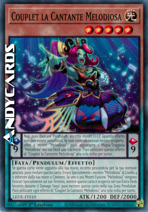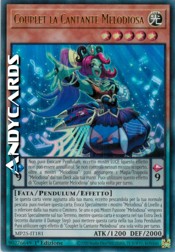 Se questa carta viene aggiunta alla tua mano, eccetto pescandola per la tua normale pescata: puoi rivelare questa carta; Evoca Specialmente 1 mostro "Melodiosa" di Livello 4 o inferiore dalla tua mano o Cimitero. Se uno o più Mostri Fusione "Melodiosa" vengono Evocati Specialmente sul tuo Terreno, mentre questa carta è scoperta nel tuo Extra Deck (eccetto durante il Damage Step): puoi mettere questa carta nella tua Zona Pendulum. Puoi utilizzare ogni effetto di "Couplet la Cantante Melodiosa" una sola volta per turno.