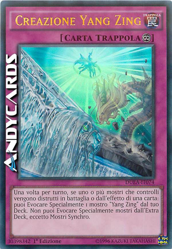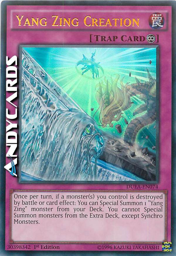 Una volta per turno, se uno o più mostri che controlli vengono distrutti in battaglia o dall'effetto di una carta: puoi Evocare Speciamente 1 mostro "Yang Zing" dal tuo Deck. Non poi Evocare Specialmente mostri dall'Extra Deck, eccetto Mostri Synchro.