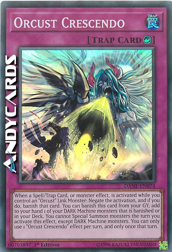 When a Spell/Trap Card, or monster effect, is activated while you control an "Orcust" Link Monster: Negate the activation, and if you do, banish that card. You can banish this card from your GY; add to your hand 1 of your DARK Machine monsters that is banished or in your Deck. You cannot Special Summon monsters the turn you activate this effect, except DARK Machine monsters. You can only use 1 "Orcust Crescendo" effect per turn, and only once that turn.