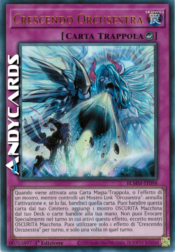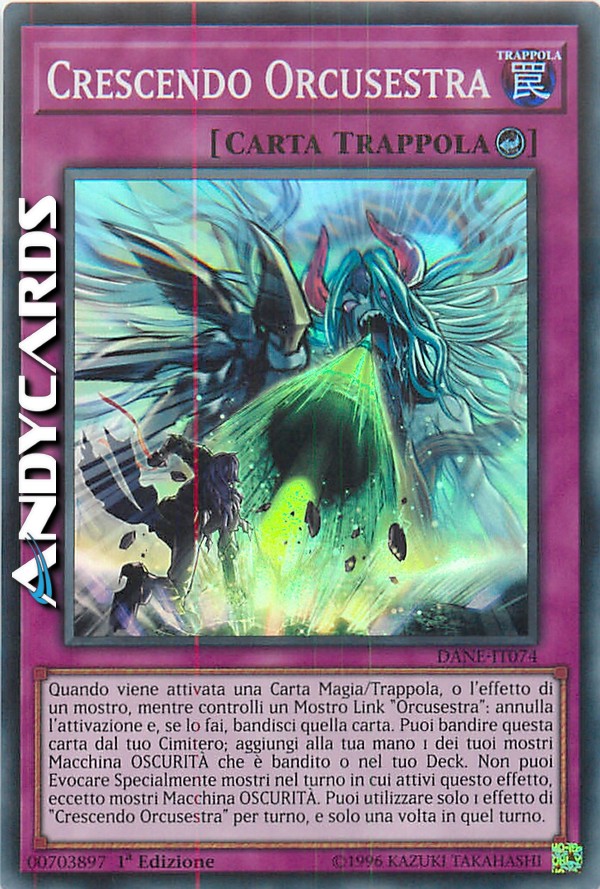 Quando viene attivata una Carta Magia/Trappola, o l'effetto di un mostro, mentre controlli un Mostro Link "Orcusestra": annulla l'attivazione e, se lo fai, bandisci quella carta. Puoi bandire questa carta dal tuo Cimitero; aggiungi alla tua mano 1 dei tuoi mostri Macchina OSCURITÀ che è bandito o nel tuo Deck. Non puoi Evocare Specialmente mostri nel turno in cui attivi questo effetto, eccetto mostri Macchina OSCURITÀ. Puoi utilizzare solo 1 effetto di "Crescendo Orcusestra" per turno, e solo una volta in quel turno.