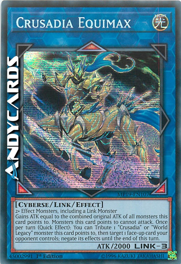 Guadagna ATK pari alla somma degli ATK originali di tutti i mostri puntati da questa carta. I mostri puntati da questa carta non possono attaccare. Una volta per turno (Effetto Rapido): puoi offrire come Tributo 1 mostro "Crociatia" o "Eredità del Mondo" puntato da questa carta, poi scegliere come bersaglio 1 carta scoperta controllata dal tuo avversario; annulla i suoi effetti fino alla fine di questo turno.