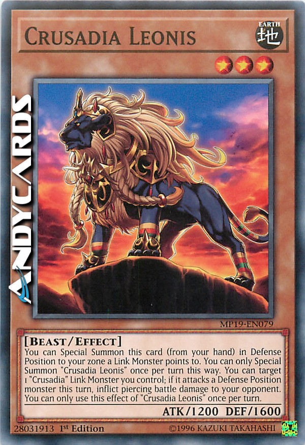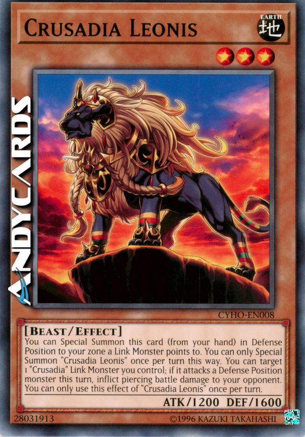 You can Special Summon this card (from your hand) in Defense Position to your zone a Link Monster points to. You can only Special Summon "Crusadia Leonis" once per turn this way. You can target 1 "Crusadia" Link Monster you control; if it attacks a Defense Position monster this turn, inflict piercing battle damage to your opponent. You can only use this effect of "Crusadia Leonis" once per turn.