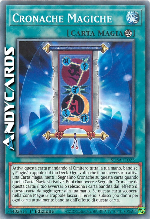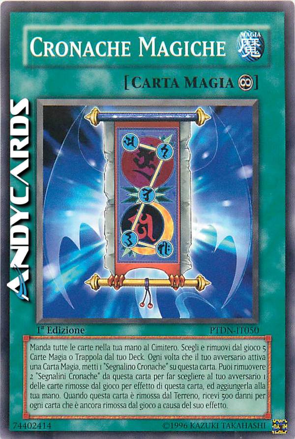 Manda tutte le carte nella tua mano al Cimitero. Scegli e rimuovi dal gioco 5 Carte Magia o Trappola dal tuo Deck. Ogni volta che il tuo avversario attiva una Carta Magia, metti 1 "Segnalino Cronache" su questa carta. Puoi rimuovere 2 "Segnalini Cronache" da questa carta per far scegliere al tuo avversario 1 delle carte rimosse dal gioco per effetto di questa carta, ed aggiungerla alla tua mano. Quando questa carta è rimossa dal Terreno, ricevi 500 danni per ogni carta che è ancora rimossa dal gioco a causa del suo effetto.