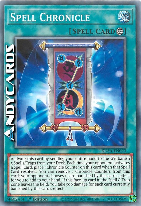 Send all cards in your hand to the Graveyard. Select and remove from play 5 Spell or Trap Cards from your Deck. Each time your opponent activates a Spell Card, place 1 Chronicle Counter on this card. You can remove 2 Chronicle Counters from this card to have your opponent select 1 of the cards removed from play with this card's effect, and add it to your hand. When this card is removed from the field, you take 500 damage for each card that is still removed from play due to this card's effect.