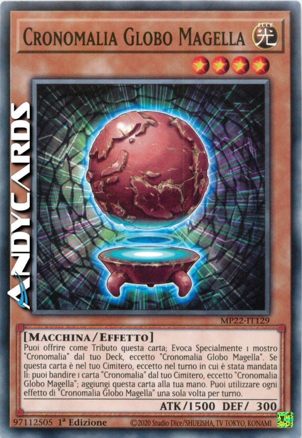 Puoi offrire come Tributo questa carta; Evoca Specialmente 1 mostro "Cronomalia" dal tuo Deck, eccetto "Cronomalia Globo Magella". Se questa carta è nel tuo Cimitero, eccetto nel turno in cui è stata mandata lì: puoi bandire 1 carta "Cronomalia" dal tuo Cimitero, eccetto "Cronomalia Globo Magella"; aggiungi questa carta alla tua mano. Puoi utilizzare ogni effetto di "Cronomalia Globo Magella" una sola volta per turno.