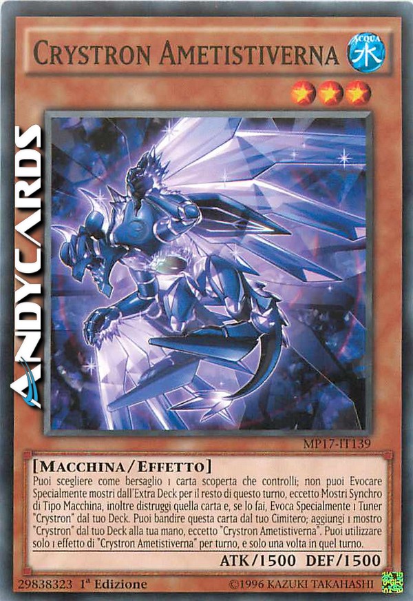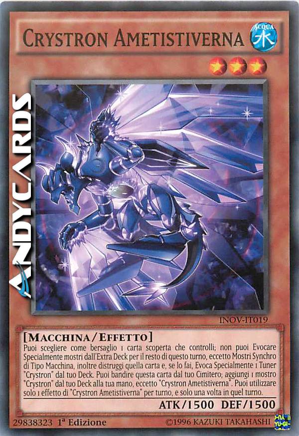 Puoi scegliere come bersaglio 1 carta scoperta che controlli; non puoi Evocare Specialmente mostri dall'Extra Deck per il resto di questo turno, eccetto Mostri Synchro di Tipo Macchina, inoltre distruggi quella carta e, se lo fai, Evoca Specialmente 1 Tuner "Crystron" dal tuo Deck. Puoi bandire questa carta dal tuo Cimitero; aggiungi 1 mostro "Crystron" dal tuo Deck alla tua mano, eccetto "Crystron Ametistiverna". Puoi utilizzare solo 1 effetto di "Crystron Ametistiverna" per turno, e solo una volta in quel turno.