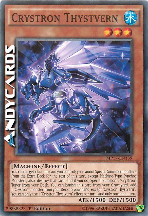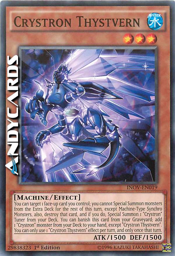 You can target 1 face-up card you control; you cannot Special Summon monsters from the Extra Deck for the rest of this turn, except Machine-Type Synchro Monsters, also destroy that card, and if you do, Special Summon 1 "Crystron" Tuner from your Deck. You can banish this card from your Graveyard; add 1 "Crystron" monster from your Deck to your hand, except "Crystron Thystvern". You can only use 1 "Crystron Thystvern" effect per turn, and only once that turn.
