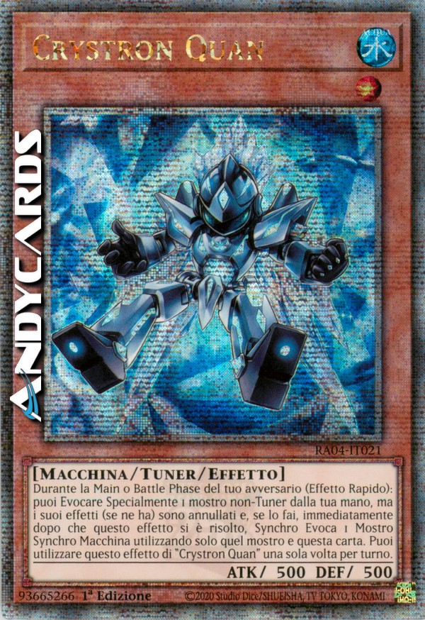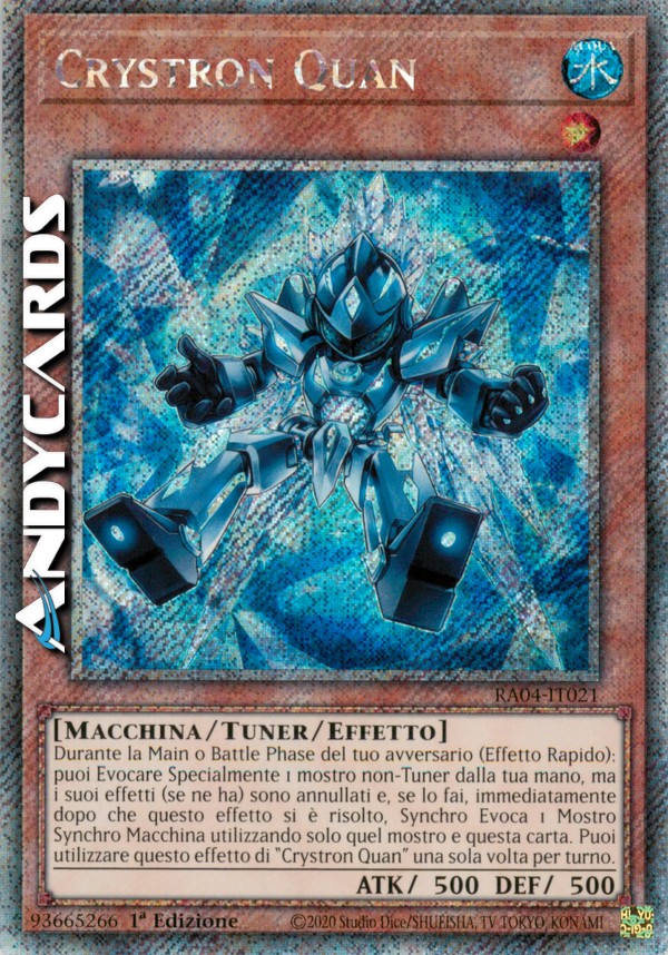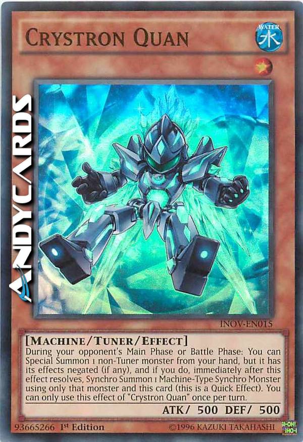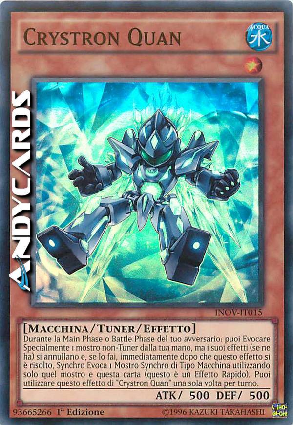 Durante la Main Phase o Battle Phase del tuo avversario: puoi Evocare Specialmente 1 mostro non-Tuner dalla tua mano, ma i suoi effetti (se ne ha) si annullano e, se lo fai, immediatamente dopo che questo effetto si è risolto, Synchro Evoca 1 Mostro Synchro di Tipo Macchina utilizzando solo quel mostro e questa carta (questo è un Effetto Rapido). Puoi utilizzare questo effetto di "Crystron Quan" una sola volta per turno.