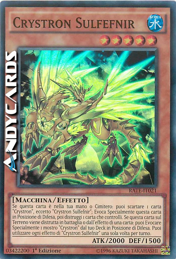 Se questa carta è nella tua mano o Cimitero: puoi scartare 1 carta "Crystron", eccetto "Crystron Sulfefnir"; Evoca Specialmente questa carta in Posizione di Difesa, poi distruggi 1 carta che controlli. Se questa carta sul Terreno viene distrutta in battaglia o dall'effetto di una carta: puoi Evocare Specialmente 1 mostro "Crystron" dal tuo Deck in Posizione di Difesa. Puoi utilizzare ogni effetto di "Crystron Sulfefnir" una sola volta per turno.