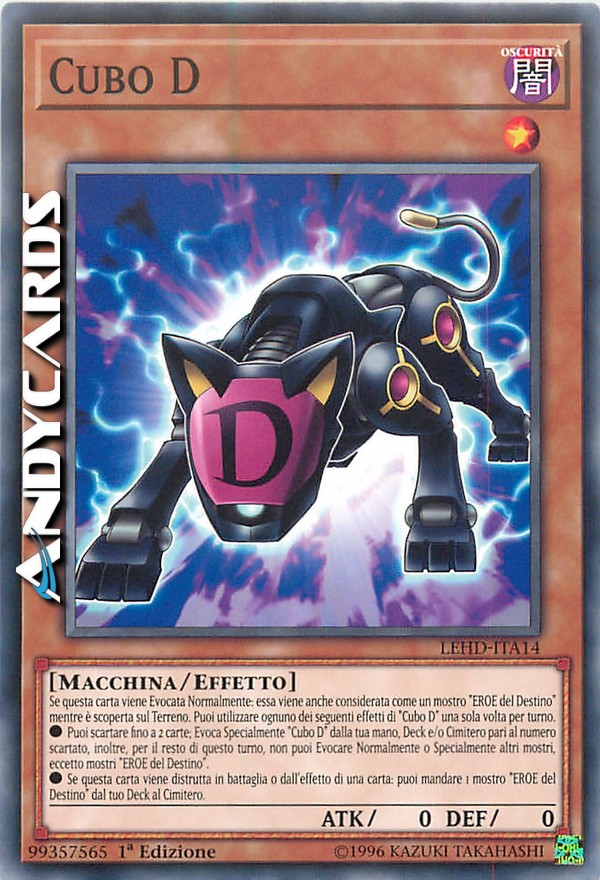 Se questa carta viene Evocata Normalmente: essa viene anche considerata come un mostro "EROE del Destino" mentre è scoperta sul Terreno. Puoi utilizzare ognuno dei seguenti effetti di "Cubo D" una sola volta per turno. ?Puoi scartare fino a 2 carte; Evoca Specialmente "Cubo D" dalla tua mano, Deck e/o Cimitero pari al numero scartato, inoltre, per il resto di questo turno, non puoi Evocare Normalmente o Specialmente altri mostri, eccetto mostri "EROE del Destino". ?Se questa carta viene distrutta in battaglia o dall'effetto di una carta: puoi mandare 1 mostro "EROE del Destino" dal tuo Deck al Cimitero.