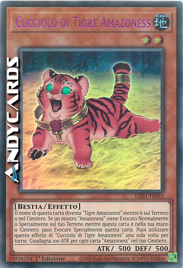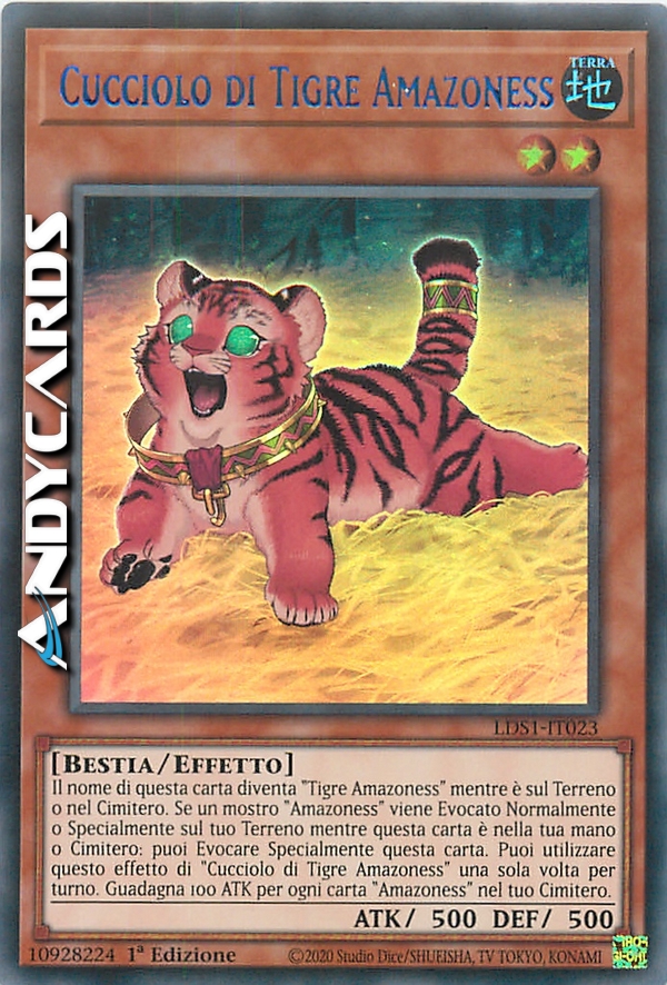 Il nome di questa carta diventa "Tigre Amazoness" mentre è sul Terreno o nel Cimitero. Se un mostro "Amazoness" viene Evocato Normalmente o Specialmente sul tuo Terreno mentre questa carta è nella tua mano o Cimitero: puoi Evocare Specialmente questa carta. Puoi utilizzare questo effetto di "Cucciolo di Tigre Amazoness" una sola volta per turno. Guadagna 100 ATK per ogni carta "Amazoness" nel tuo Cimitero.