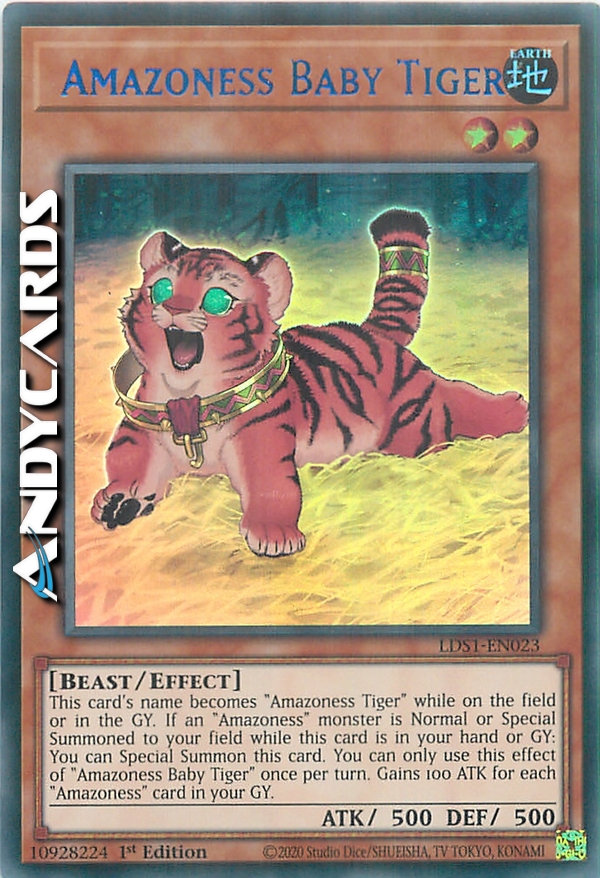 This card's name becomes "Amazoness Tiger" while on the field or in the GY. If an "Amazoness" monster is Normal or Special Summoned to your field while this card is in your hand or GY: You can Special Summon this card. You can only use this effect of "Amazoness Baby Tiger" once per turn. Gains 100 ATK for each "Amazoness" card in your GY.