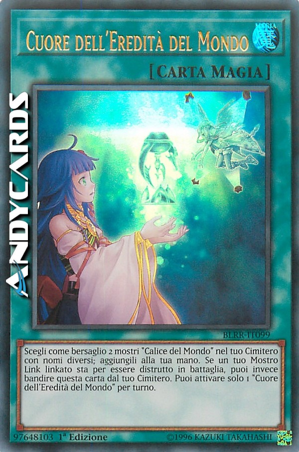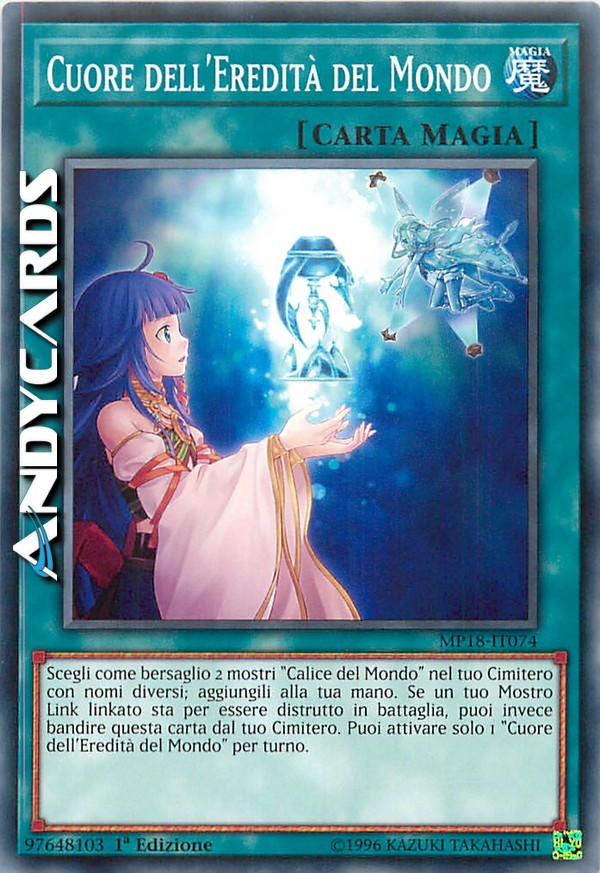 Scegli come bersaglio 2 mostri "Calice del Mondo" nel tuo Cimitero con nomi diversi; aggiungili alla tua mano. Se un tuo Mostro Link linkato sta per essere distrutto in battaglia, puoi invece bandire questa carta dal tuo Cimitero. Puoi attivare solo 1 "Cuore del Eredità del Mondo" per turno.