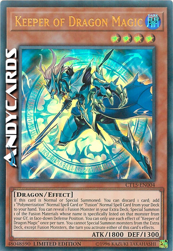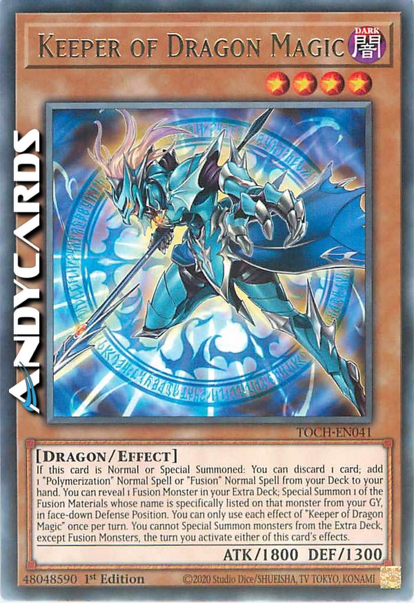 If this card is Normal or Special Summoned: You can discard 1 card; add 1 "Polymerization" Normal Spell or "Fusion" Normal Spell from your Deck to your hand. You can reveal 1 Fusion Monster in your Extra Deck; Special Summon 1 of the Fusion Materials whose name is specifically listed on that monster from your GY, in face-down Defense Position. You can only use each effect of "Keeper of Dragon Magic" once per turn. You cannot Special Summon monsters from the Extra Deck, except Fusion Monsters, the turn you activate either of this card's effects.