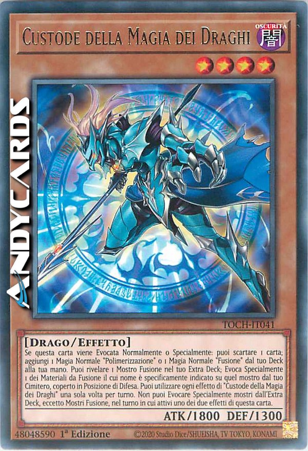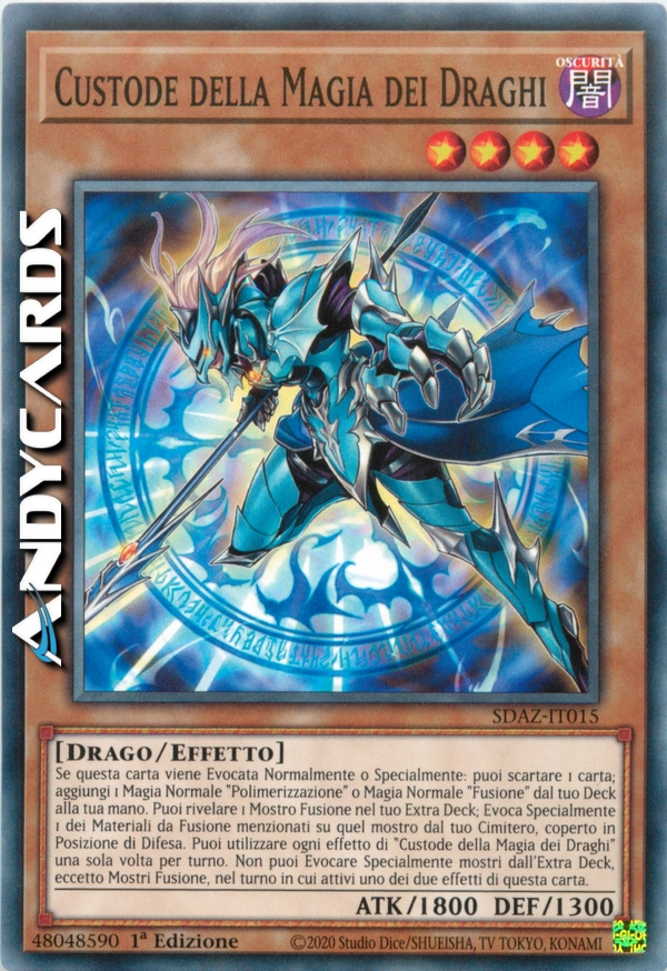 Se questa carta viene Evocata Normalmente o Specialmente: puoi scartare 1 carta; aggiungi 1 Magia Normale "Polimerizzazione" o 1 Magia Normale "Fusione" dal tuo Deck alla tua mano. Puoi rivelare 1 Mostro Fusione nel tuo Extra Deck; Evoca Specialmente 1 dei Materiali da Fusione il cui nome è specificamente indicato su quel mostro dal tuo Cimitero, coperto in Posizione di Difesa. Puoi utilizzare ogni effetto di "Custode della Magia dei Draghi" una sola volta per turno. Non puoi Evocare Specialmente mostri dall'Extra Deck, eccetto Mostri Fusione, nel turno in cui attivi uno dei due effetti di questa carta.