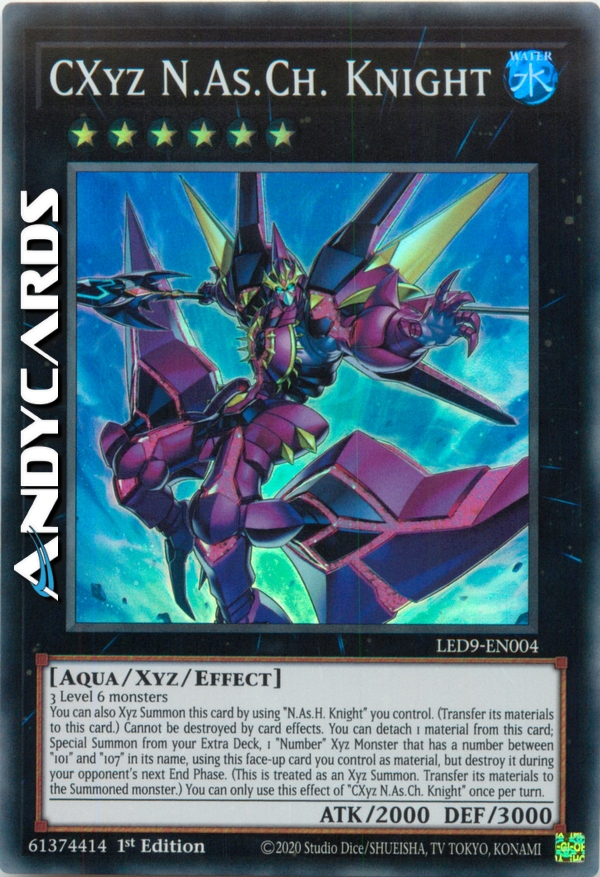 Puoi anche Evocare Xyz questa carta utilizzando un "Cavaliere N.As.H." che controlli (trasferisci i suoi materiali su questa carta). Non può essere distrutto dagli effetti delle carte. Puoi staccare 1 materiale da questa carta; Evoca Specialmente dal tuo Extra Deck 1 Mostro Xyz "Numero" che ha un numero tra "101" e "107" nel suo nome, utilizzando questa carta scoperta che controlli (questa viene considerata come un'Evocazione Xyz, trasferisci i suoi materiali sul mostro Evocato), ma distruggila durante la prossima End Phase del tuo avversario. Puoi utilizzare questo effetto di "CXyz Cavaliere N.As.Ch." una sola volta per turno.