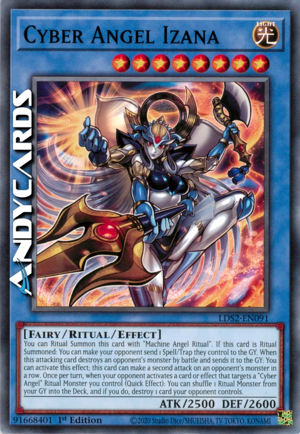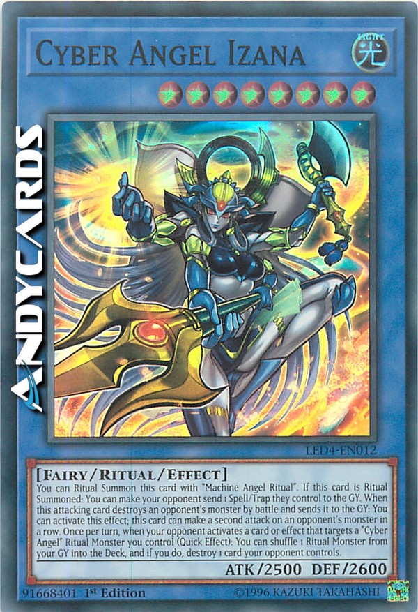You can Ritual Summon this card with "Machine Angel Ritual". If this card is Ritual Summoned: You can make your opponent send 1 Spell/Trap they control to the GY. When this attacking card destroys an opponent's monster by battle and sends it to the GY: You can activate this effect; this card can make a second attack on an opponent's monster in a row. Once per turn, when your opponent activates a card or effect that targets a "Cyber Angel" Ritual Monster you control (Quick Effect): You can shuffle 1 Ritual Monster from your GY into the Deck, and if you do, destroy 1 card your opponent controls.