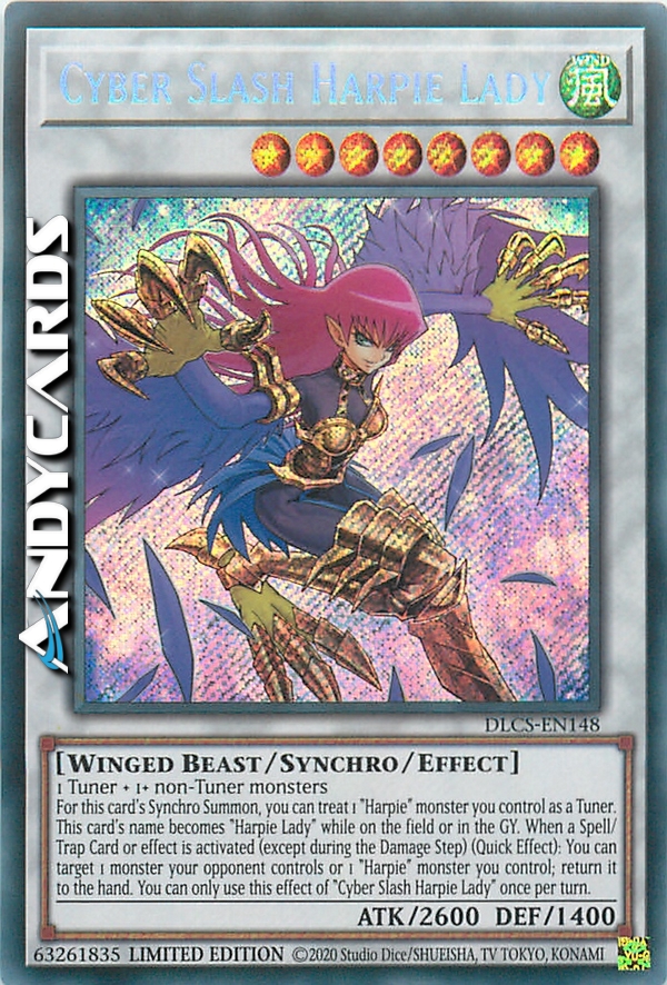 For this card's Synchro Summon, you can treat 1 "Harpie" monster you control as a Tuner. This card's name becomes "Harpie Lady" while on the field or in the GY. When a Spell/Trap Card or effect is activated (except during the Damage Step) (Quick Effect): You can target 1 monster your opponent controls or 1 "Harpie" monster you control; return it to the hand. You can only use this effect of "Cyber Slash Harpie Lady" once per turn.