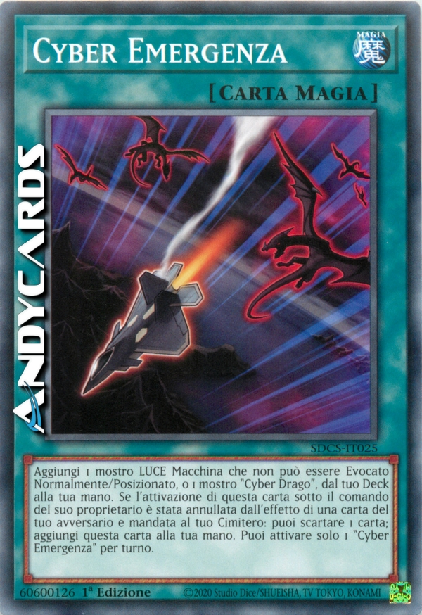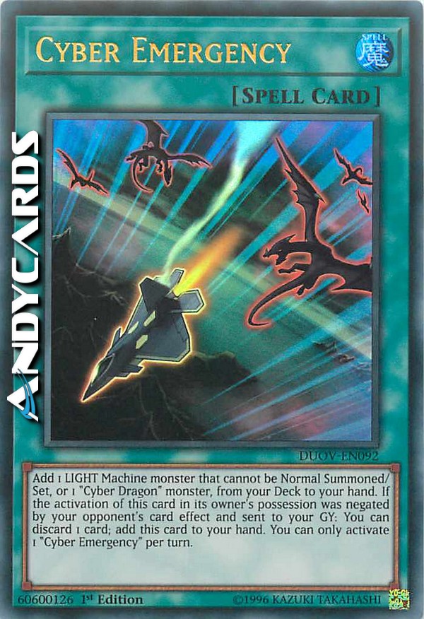 Aggiungi 1 mostro LUCE Macchina che non può essere Evocato Normalmente/Posizionato, o 1 mostro "Cyber Drago", dal tuo Deck alla tua mano. Se l'attivazione di questa carta sotto il comando del suo proprietario è stata annullata dall'effetto di una carta del tuo avversario e mandata al tuo Cimitero: puoi scartare 1 carta; aggiungi questa carta alla tua mano. Puoi attivare solo 1 "Cyber Emergenza" per turno.