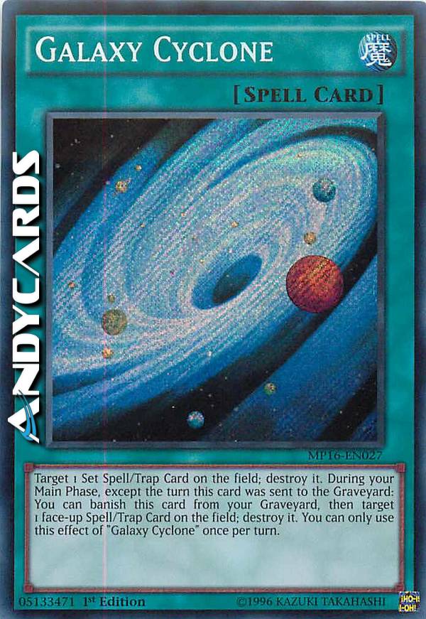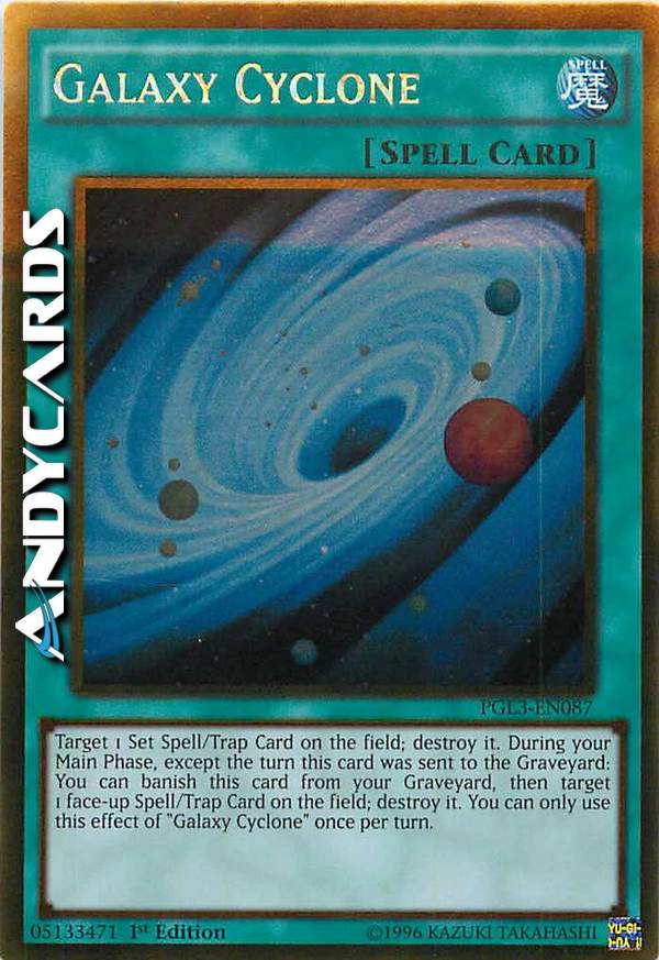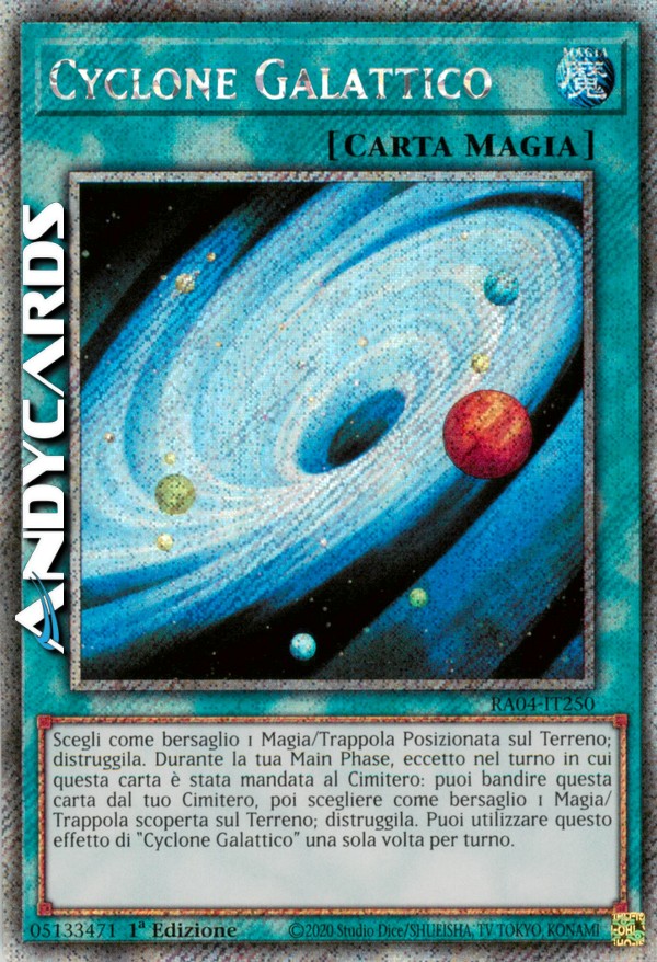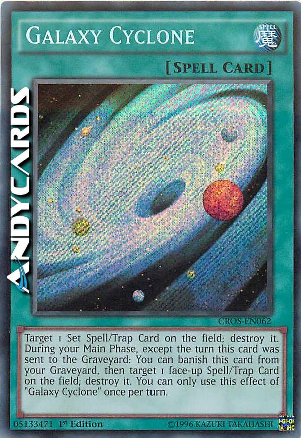 Scegli come bersaglio 1 Carta Magia/Trappola Posizionata sul Terreno; distruggila. Durante la tua Main Phase, eccetto nel turno in cui questa carta è stata mandata al Cimitero: puoi bandire questa carta dal tuo Cimitero, poi scegliere come bersaglio 1 Carta Magia/Trappola scoperta sul Terreno; distruggila. Puoi utilizzare questo effetto di "Cyclone Galattico" una sola volta per turno.