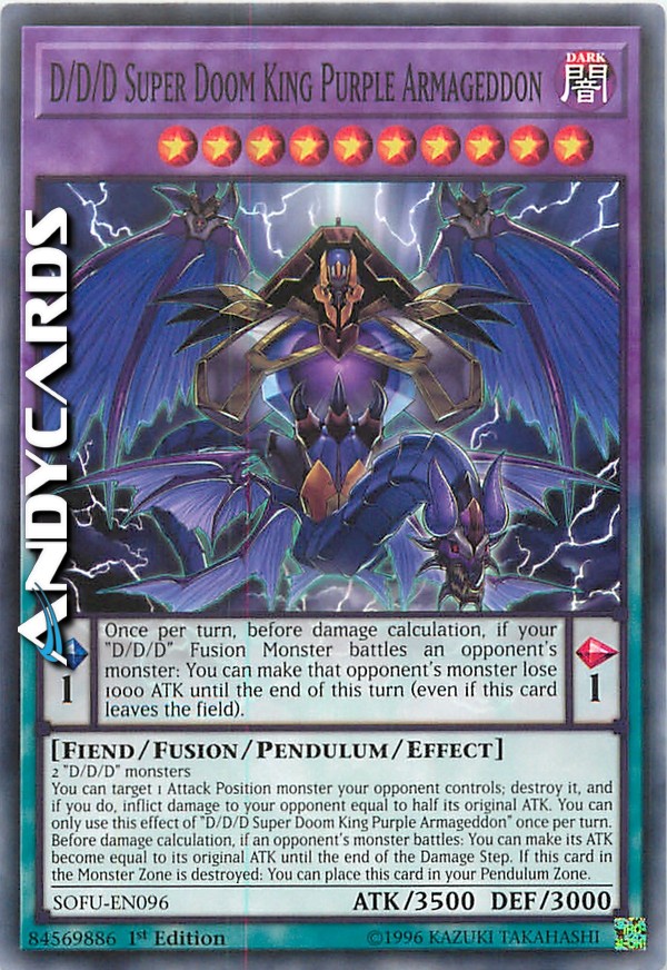 You can target 1 Attack Position monster your opponent controls; destroy it, and if you do, inflict damage to your opponent equal to half its original ATK. You can only use this effect of "D/D/D Super Doom King Purple Armageddon" once per turn. Before damage calculation, if an opponent's monster battles: You can make its ATK become equal to its original ATK until the end of the Damage Step. If this card in the Monster Zone is destroyed: You can place this card in your Pendulum Zone.