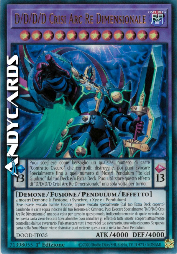 Deve essere Evocato tramite Fusione, oppure Evocato Specialmente (dal tuo Extra Deck coperto) bandendo le carte sopra indicate dal tuo Terreno e/o Cimitero. Puoi Evocare Specialmente "D/D/D/D Crisi Arc Re Dimensionale" una sola volta per turno in questo modo, indipendentemente da quale metodo usi. Se questa carta viene Evocata Specialmente: puoi annullare gli effetti di tutti i mostri scoperti attualmente controllati dal tuo avversario. Può attaccare tutti i mostri del tuo avversario, una volta ciascuno. Se questa carta nella Zona Mostri viene distrutta: puoi mettere questa carta nella tua Zona Pendulum.