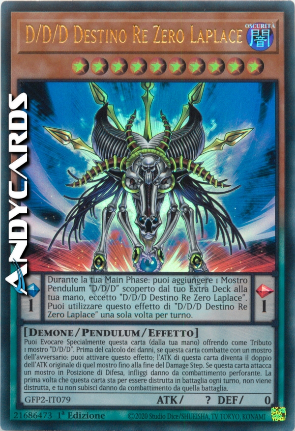 Effetto Pendulum: Durante la tua Main Phase: puoi aggiungere 1 Mostro Pendulum "D/D/D" scoperto dal tuo Extra Deck alla tua mano, eccetto "D/D/D Destino Re Zero Laplace". Puoi utilizzare questo effetto di "D/D/D Destino Re Zero Laplace" una sola volta per turno.