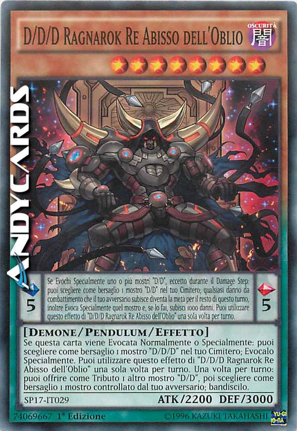 Se Evochi Specialmente uno o più mostri "D/D", eccetto durante il Damage Step: puoi scegliere come bersaglio 1 mostro "D/D" nel tuo Cimitero; qualsiasi danno da combattimento che il tuo avversario subisce diventa la metà per il resto di questo turno, inoltre Evoca Specialmente quel mostro e, se lo fai, subisci 1000 danni. Puoi utilizzare questo effetto di "D/D/D Ragnarok Re Abisso dell'Oblio" una sola volta per turno. - Se questa carta viene Evocata Normalmente o Specialmente: puoi scegliere come bersaglio 1 mostro "D/D/D" nel tuo Cimitero; Evocalo Specialmente. Puoi utilizzare questo effetto di "D/D/D Ragnarok Re Abisso dell'Oblio" una sola volta per turno. Una volta per turno: puoi offrire come Tributo 1 altro mostro "D/D", poi scegliere come bersaglio 1 mostro controllato dal tuo avversario; bandiscilo.