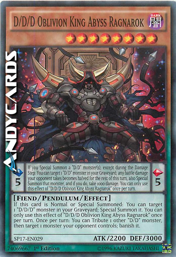 If this card is Normal or Special Summoned: You can target 1 "D/D/D" monster in your Graveyard; Special Summon it. You can only use this effect of "D/D/D Oblivion King Abyss Ragnarok" once per turn. Once per turn: You canTribute 1 other "D/D" monster, then target 1 monster your opponent controls; banish it. - Pendulum Scale: 5 - Pendulum Effect: If you Special Summon a "D/D" monster(s), except during the Damage Step: You can target 1 "D/D" monster in your Graveyard; any battle damage your opponent takes becomes halved for the rest of this turn, also Special Summon that monster, and if you do, take 1000 damage. You can only use this effect of "D/D/D Oblivion King Abyss Ragnarok" once per turn.