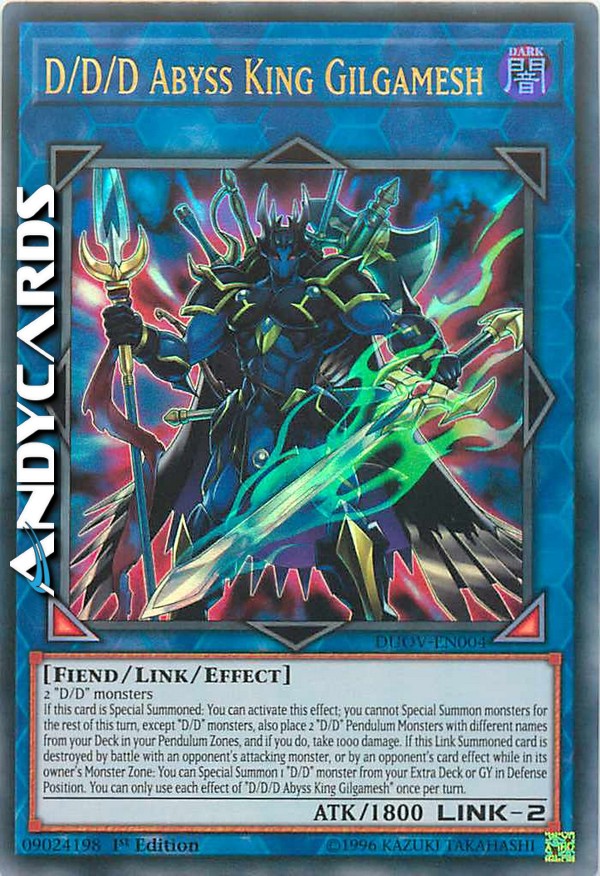 Se questa carta viene Evocata Specialmente: puoi attivare questo effetto; non puoi Evocare Specialmente mostri per il resto di questo turno, eccetto mostri "D/D", inoltre metti 2 Mostri Pendulum "D/D" con nomi diversi dal tuo Deck nelle tue Zone Pendulum e, se lo fai, subisci 1000 danni. Se questa carta Evocata Link viene distrutta in battaglia con un mostro attaccante dell'avversario, o dall'effetto di una carta dell'avversario mentre è nella Zona Mostri del suo proprietario: puoi Evocare Specialmente 1 mostro "D/D" dal tuo Extra Deck o Cimitero in Posizione di Difesa. Puoi utilizzare ogni effetto di "D/D/D Re dell'Abisso Gilgamesh" una sola volta per turno.