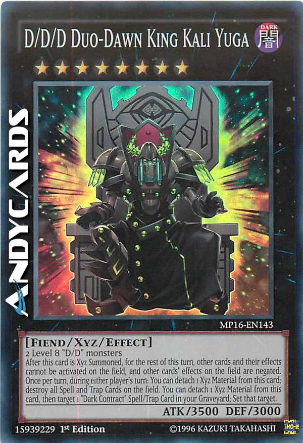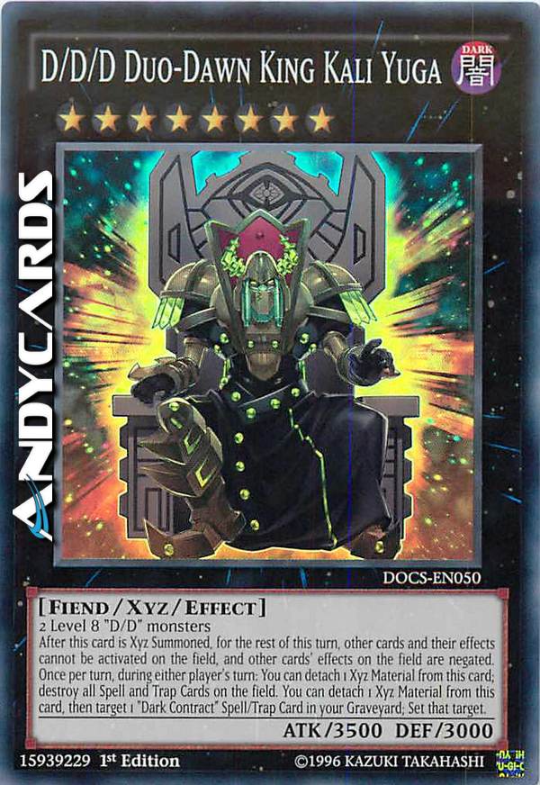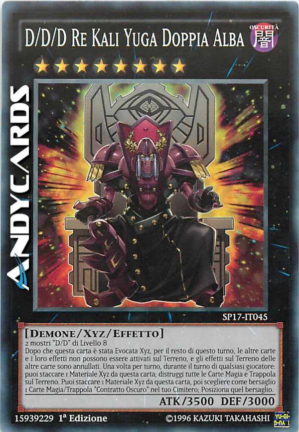 2 mostri "D/D" di Livello 8 - Dopo che questa carta è stata Evocata Xyz, per il resto di questo turno, le altre carte e i loro effetti non possono essere attivati sul Terreno, e gli effetti sul Terreno delle altre carte sono annullati. Una volta per turno, durante il turno di qualsiasi giocatore: puoi staccare 1 Materiale Xyz da questa carta; distruggi tutte le Carte Magia e Trappola sul Terreno. Puoi staccare 1 Materiale Xyz da questa carta, poi scegliere come bersaglio 1 Carte Magia/Trappola "Contratto Oscuro" nel tuo Cimitero; Posiziona quel bersaglio.