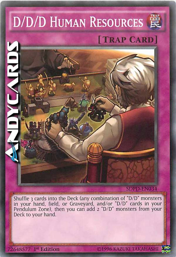 Mischia 3 carte nel Deck (qualsiasi combinazione di mostri "D/D" nella tua mano, Terreno o Cimitero, e/o carte "D/D" nella tua Zona Pendulum), poi puoi aggiungere 2 mostri "D/D" dal tuo Deck alla tua mano.
