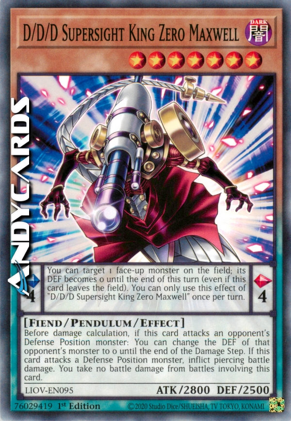 Pendulum Effect: You can target 1 face-up monster on the field; its DEF becomes 0 until the end of this turn (even if this card leaves the field). You can only use this effect of "D/D/D Supersight King Zero Maxwell" once per turn.