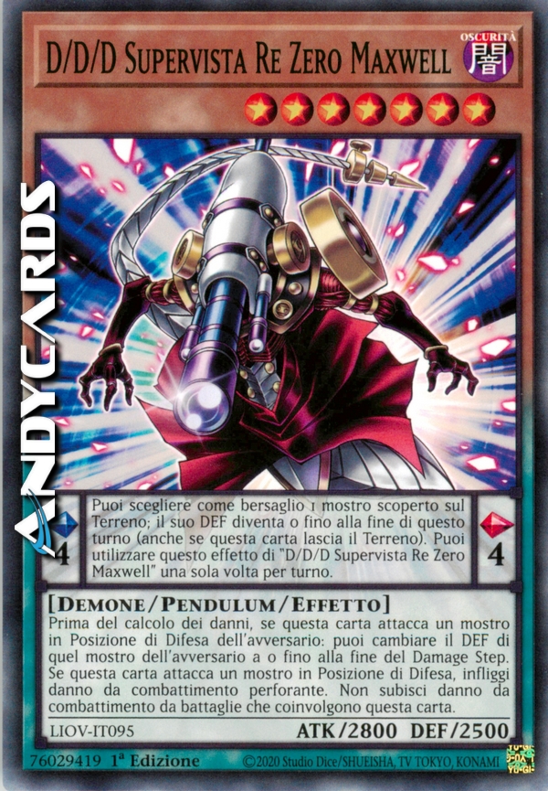 Effetto Pendulum: Puoi scegliere come bersaglio 1 mostro scoperto sul Terreno; il suo DEF diventa 0 fino alla fine di questo turno (anche se questa carta lascia il Terreno). Puoi utilizzare questo effetto di "D/D/D Supervista Re Zero Maxwell" una sola volta per turno.