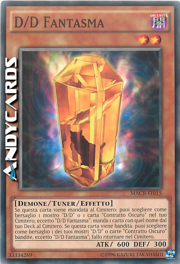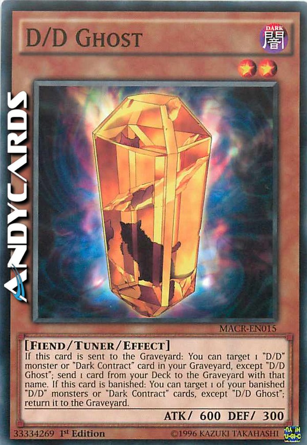 Se questa carta viene mandata al Cimitero: puoi scegliere come bersaglio 1 mostro "D/D" o 1 carta "Contratto Oscuro" nel tuo Cimitero, eccetto "D/D Fantasma"; manda 1 carta con quel nome dal tuo Deck al Cimitero. Se questa carta viene bandita: puoi scegliere come bersaglio 1 dei tuoi mostri "D/D" o carte "Contratto Oscuro" bandite, eccetto "D/D Fantasma"; fallo ritornare nel Cimitero.