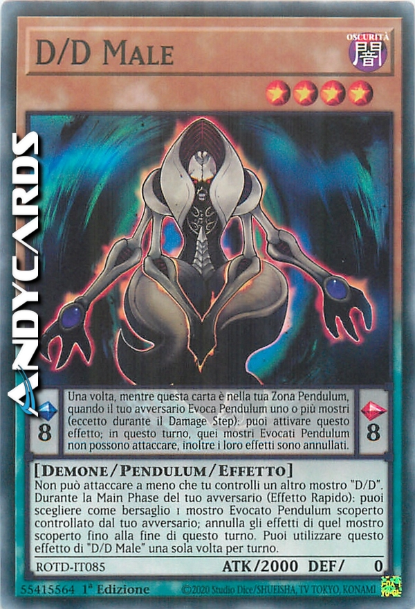 Non può attaccare a meno che tu controlli un altro mostro "D/D". Durante la Main Phase del tuo avversario (Effetto Rapido): puoi scegliere come bersaglio 1 mostro Evocato Pendulum scoperto controllato dal tuo avversario; annulla gli effetti di quel mostro scoperto fino alla fine di questo turno. Puoi utilizzare questo effetto di "D/D Male" una sola volta per turno.