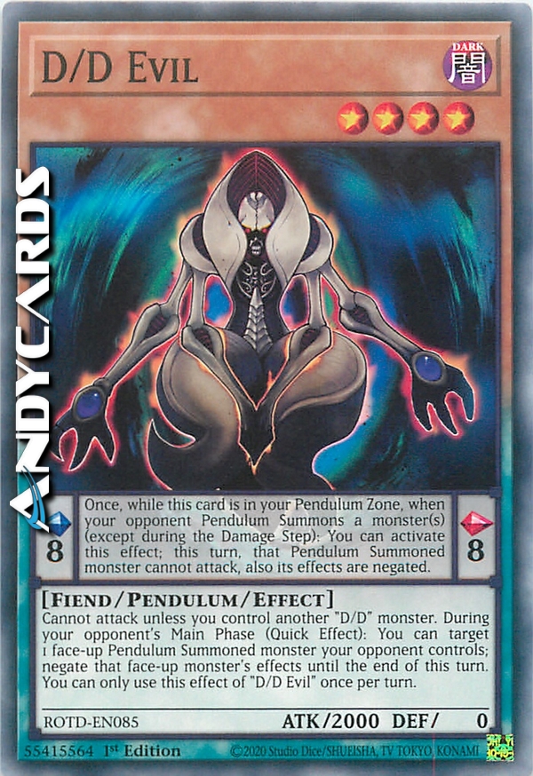 Cannot attack unless you control another "D/D" monster. During your opponent's Main Phase (Quick Effect): You can target 1 face-up Pendulum Summoned monster your opponent controls; negate that face-up monster's effects until the end of this turn. You can only use this effect of "D/D Evil" once per turn.