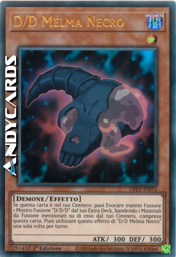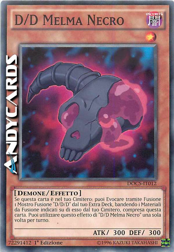 Se questa carta è nel tuo Cimitero: puoi Evocare tramite Fusione 1 Mostro Fusione "D/D/D" dal tuo Extra Deck, bandendo i Materiali da Fusione indicati su di esso dal tuo Cimitero, compresa questa carta. Puoi utilizzare questo effetto di "D/D Melma Necro" una sola volta per turno.