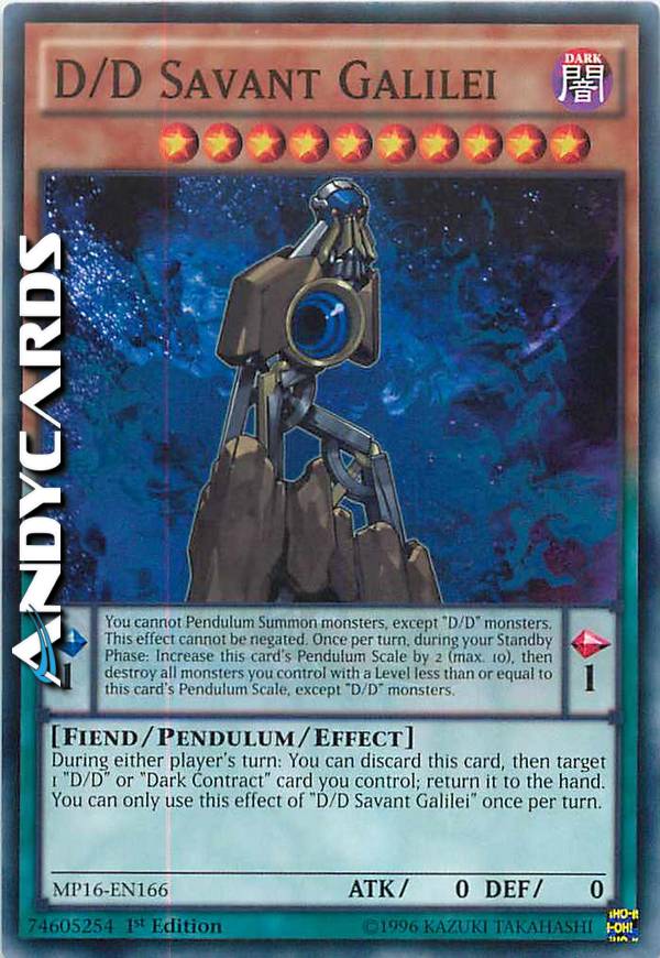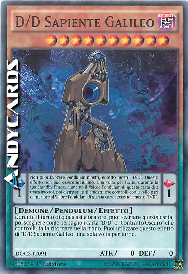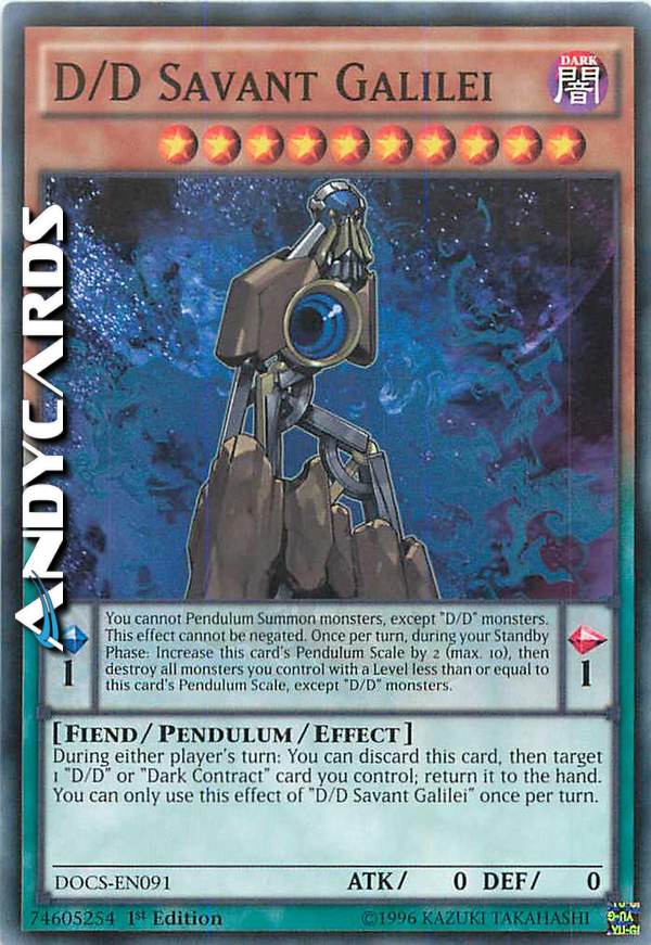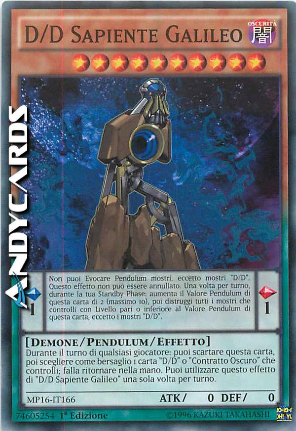 Durante il turno di qualsiasi giocatore: puoi scartare questa carta, poi scegliere come bersaglio 1 carta "D/D" o "Contratto Oscuro" che controlli; falla ritornare nella mano. Puoi utilizzare questo effetto di "D/D Sapiente Galileo" una sola volta per turno. Effetto Pendulum: Non puoi Evocare Pendulum mostri, eccetto mostri "D/D". Questo effetto non può essere annullato. Una volta per turno, durante la tua Standby Phase: aumenta il Valore Pendulum di questa carta di 2 (massimo 10), poi distruggi tutti i mostri che controlli con Livello pari o inferiore al Valore Pendulum di questa carta, eccetto i mostri "D/D".