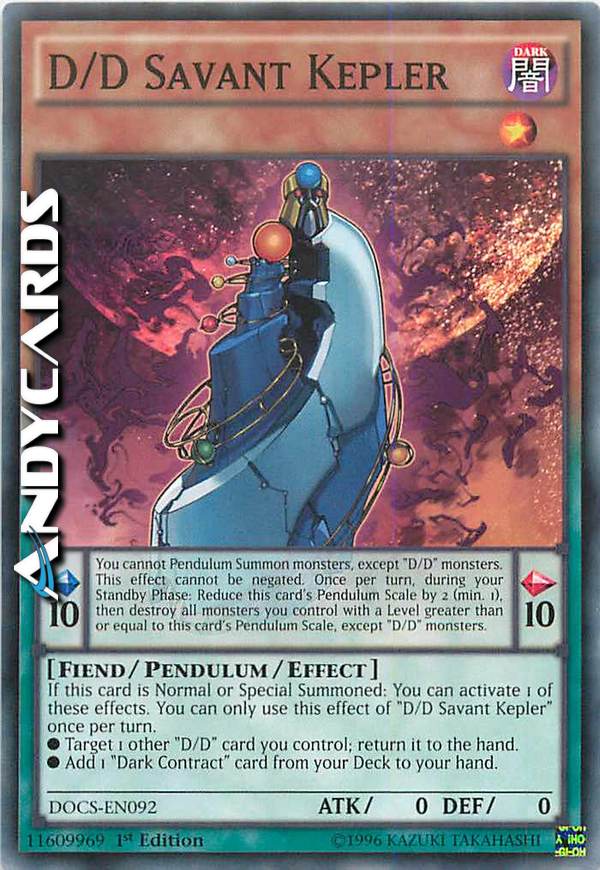 Valore Pendulum 10 Non puoi Evocare Pendulum mostri, eccetto mostri "D/D". Questo effetto non può essere annullato. Una volta per turno, durante la tua Standby Phase: riduci il Valore Pendulum di questa carta di 2 (minimo 1), poi distruggi tutti i mostri che controlli con Livello pari o superiore al Valore Pendulum di questa carta, eccetto i mostri "D/D". - Se questa carta viene Evocata Normalmente o Specialmente: puoi attivare 1 di questi effetti. Puoi utilizzare questo effetto di "D/D Sapiente Keplero" una sola volta per turno. - Scegli come bersaglio 1 altra carta "D/D" che controlli; falla ritornare nella mano. - Aggiungi 1 carta "Contratto Oscuro" dal tuo Deck alla tua mano.