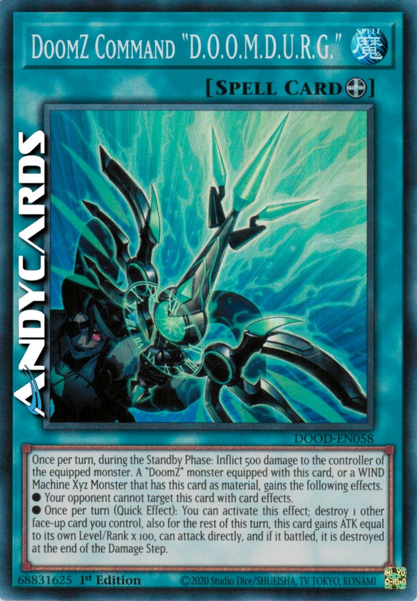 Once per turn, during the Standby Phase: Inflict 500 damage to the controller of the equipped monster. A "DoomZ" monster equipped with this card, or a WIND Machine Xyz Monster that has this card as material, gains the following effects.