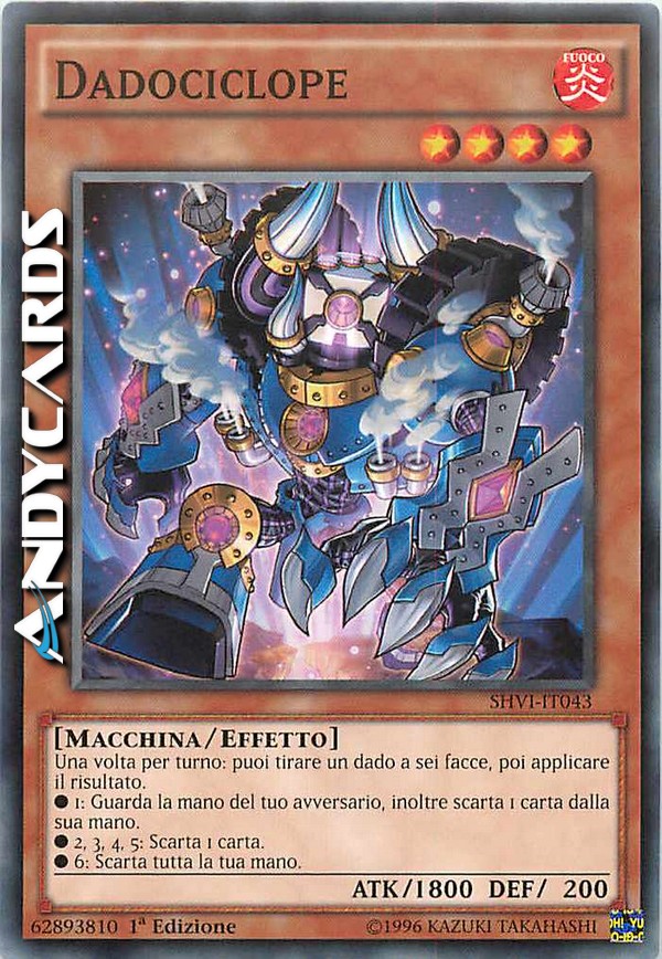 Una volta per turno: puoi tirare un dado a sei facce, poi applicare il risultato. - 1: Guarda la mano del tuo avversario, inoltre scarta 1 carta dalla sua mano. 2, 3, 4, 5: Scarta 1 carta. 6: Scarta tutta la tua mano.