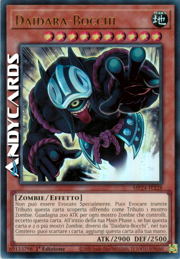 Non può essere Evocato Specialmente. Puoi Evocare tramite Tributo questa carta scoperta offrendo come Tributo 1 mostro Zombie. Guadagna 200 ATK per ogni mostro Zombie che controlli, eccetto questa carta. All'inizio della tua Main Phase 1, se hai questa carta e 2 o più mostri Zombie, diversi da "Daidara-Bocchi", nel tuo Cimitero: puoi scartare 1 carta; aggiungi questa carta alla tua mano.