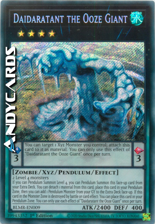 If you can Pendulum Summon Level 4, you can Pendulum Summon this face-up card from your Extra Deck. You can detach 1 material from this card; place this card in your Pendulum Zone, then you can add 1 Pendulum Monster from your GY to the Extra Deck face-up. If this card in the Monster Zone is destroyed by battle or card effect: You can place this card in your Pendulum Zone. You can only use each effect of "Daidaratant the Ooze Giant" once per turn.