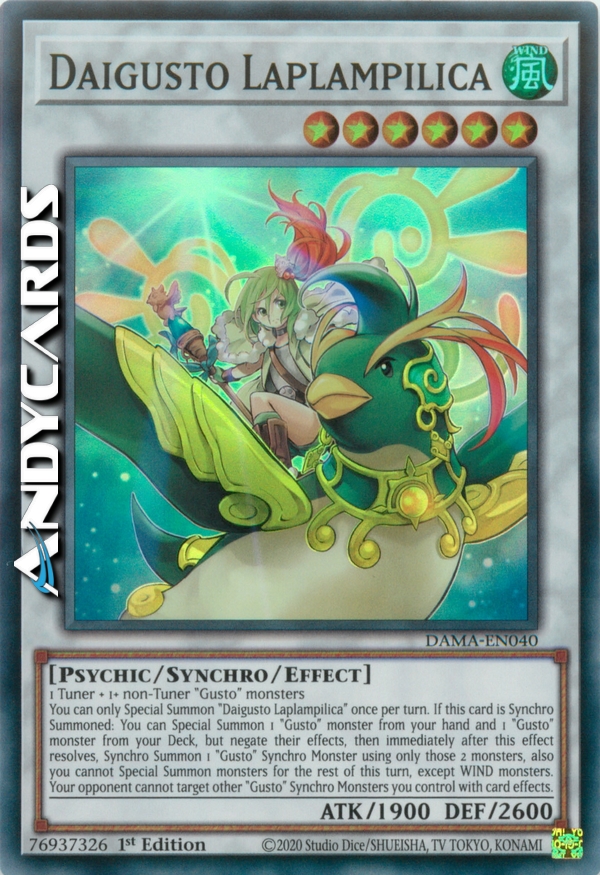 Puoi Evocare Specialmente "Daigusto Laplampilica" una sola volta per turno. Se questa carta viene Synchro Evocata: puoi Evocare Specialmente 1 mostro "Gusto" dalla tua mano e 1 mostro "Gusto" dal tuo Deck, ma annulla i loro effetti, poi immediatamente dopo che questo effetto si è risolto, Synchro Evoca 1 Mostro Synchro "Gusto" utilizzando solo quei 2 mostri, inoltre non puoi Evocare Specialmente mostri per il resto di questo turno, eccetto mostri VENTO. Il tuo avversario non può scegliere come bersaglio altri Mostri Synchro "Gusto" che controlli con gli effetti delle carte.