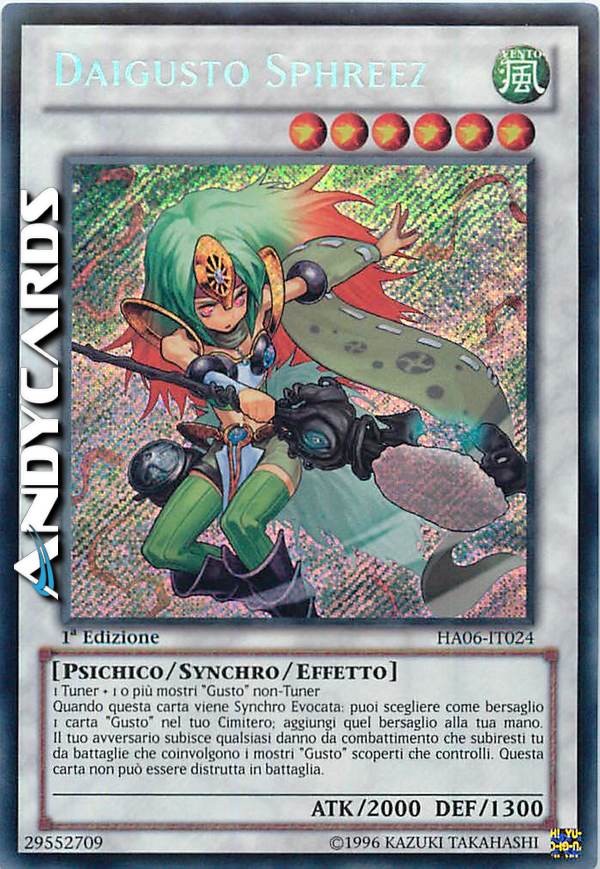 Quando questa carta viene Synchro Evocata: puoi scegliere come bersaglio 1 carta "Gusto" nel tuo Cimitero; aggiungi quel bersaglio alla tua mano. Il tuo avversario subisce qualsiasi danno da combattimento che subiresti tu da battaglie che coinvolgono i mostri "Gusto" scoperti che controlli. Questa carta non può essere distrutta in battaglia.